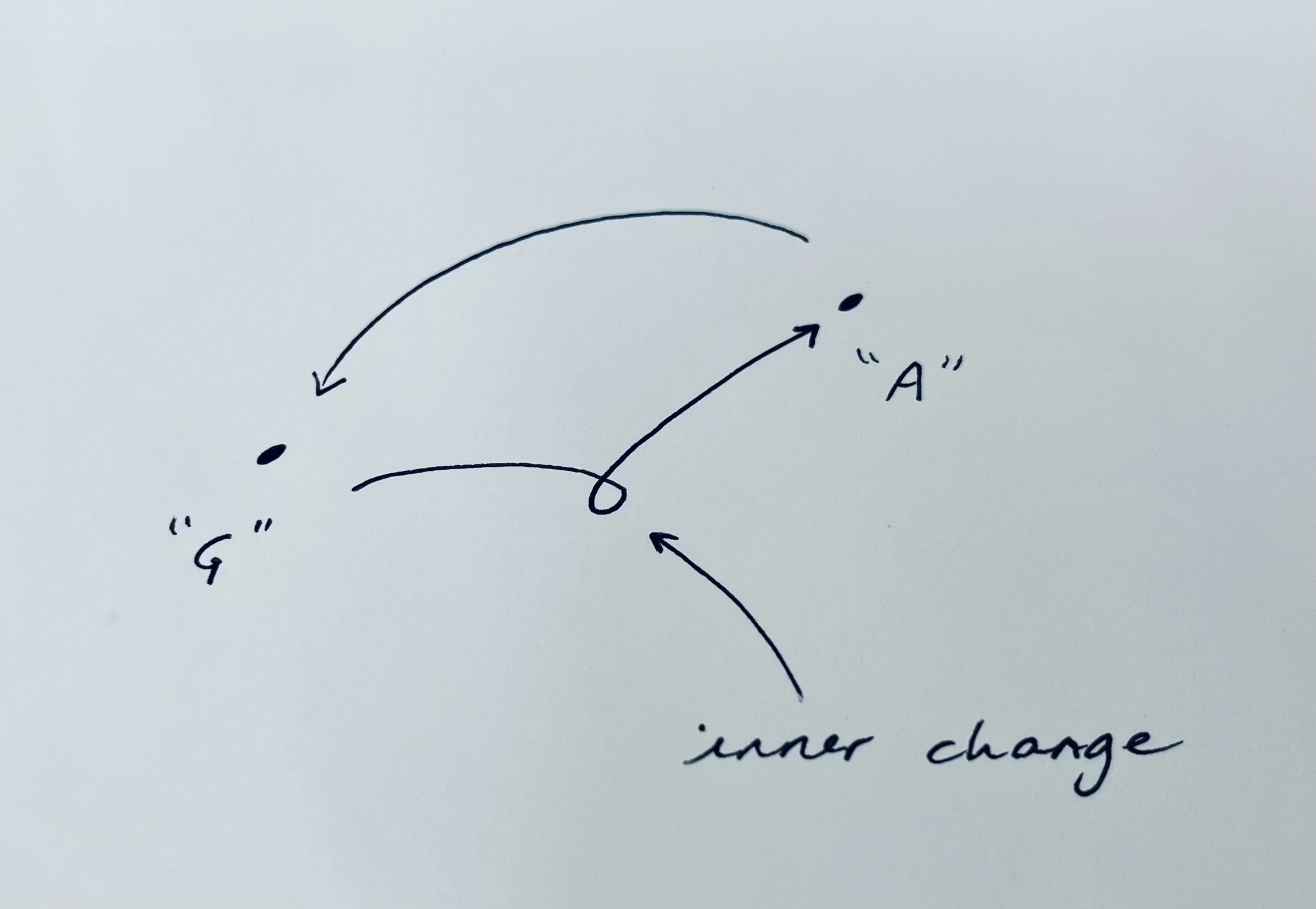 The change from one to another wouldn’t be possible without perceiving the whole: the two notes, and the gap between them. A much better word than gap, distance, or interval, is a relation. Music is not just made up, or composed, of these relations. Music is the sound relations. The relations exist only within you. Once you identify the relation, the change, you can then try performing it again, but this time, not as two separate notes, but as one thing: the sound relation.